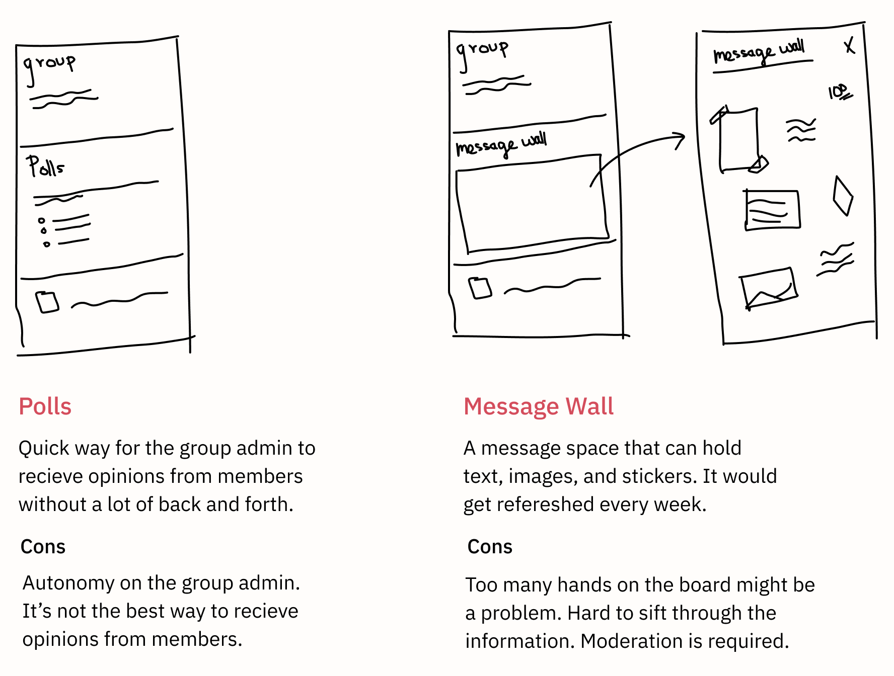 Based on the insights gathered we brainstormed some feature ideas as a team in the form of rough sketches. We then grouped similar features and talked through pros and cons for each of them. Finally, the team did dot voting to prioritize and select features to prototype.