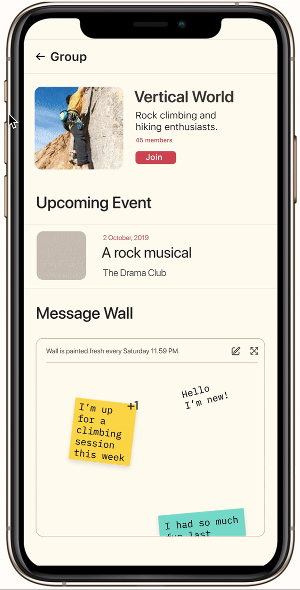 We wanted to introduce a way for members within a group to communicate. We didn't want to go the traditional messaging interface as one of the objectives was to find an effective way to connect virtual and real life environments. We believe message walls in each group would provide a fun and engaging way of communication. To better regulate the content, the wall is cleared once every 7 days.