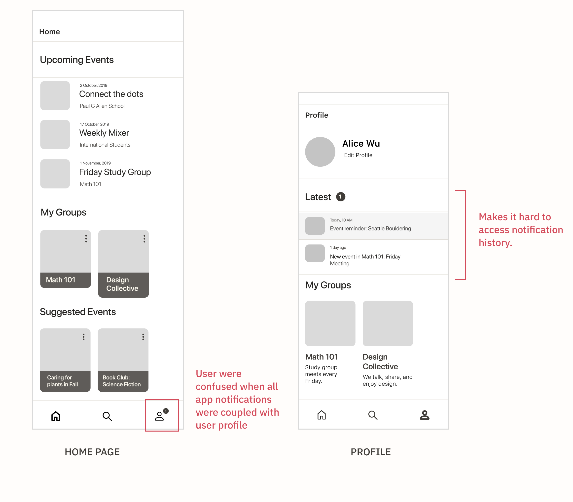 Participants were confused by the placement of the notification section in the user profile page. The design also made it harder to view notification history.